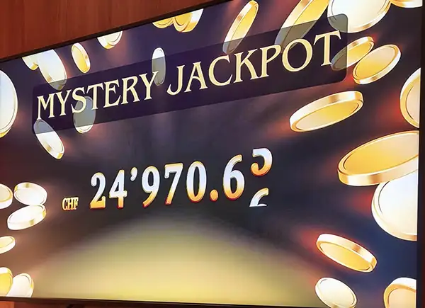The Davos Mystery Jackpot is not a game but an extra chance to win. Some of our gaming machines are connected. A random generator determines when and on which device the jackpot will fall. The guest whose bet happened to result in the payout wins. Every time you start a game, the Davos Mystery Jackpot could drop on your machine.